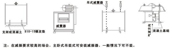 首先拆箱检查风机各部在运输中有否变形或损坏,若有此情形,应待检修校正后方可正式安装使用。 1。打开接线盒,接通电源度运转(空载),叶轮旋转方向与铭牌箭头相同,风机外壳需接地,并观察其有否碰壳,若有此情形,应立即予以调整。 2。风机接线法兰应接帆布或其他软性接管,以利于风机与管道的隔振,风机不应承爱外接风管的重量,屋顶式风机与基础连接处及分体式风帽装连接处应加减振垫,并加注密封胶以避免漏风。 3.风机安装就位,所有紧固件必须重新紧固一次。 4。待清除风机进出口管道及附近一切障碍物后放可正式投入使用。