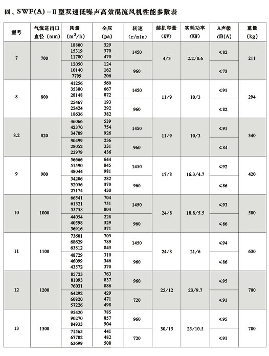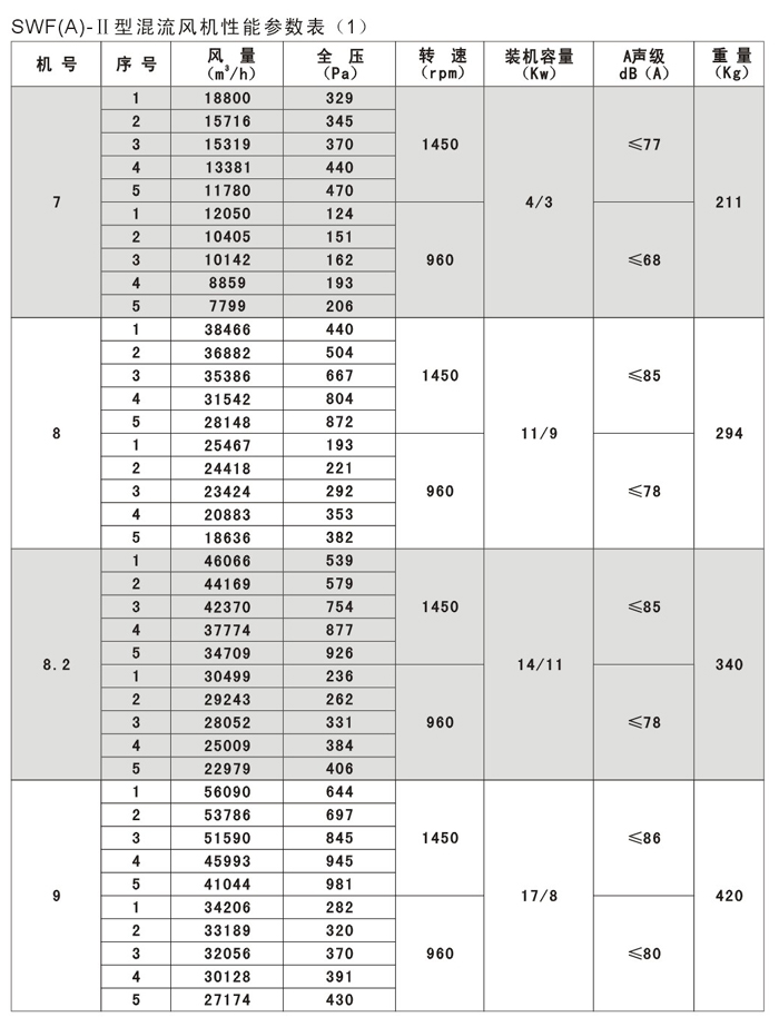 根据气流子午加速原理,风机具有离心和轴流的双重特性,即既有较高的压力又有较大的流量,并具有效率高、噪声低且高效区宽广等优点。