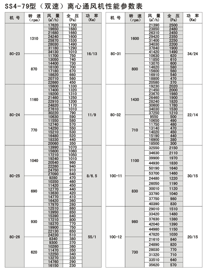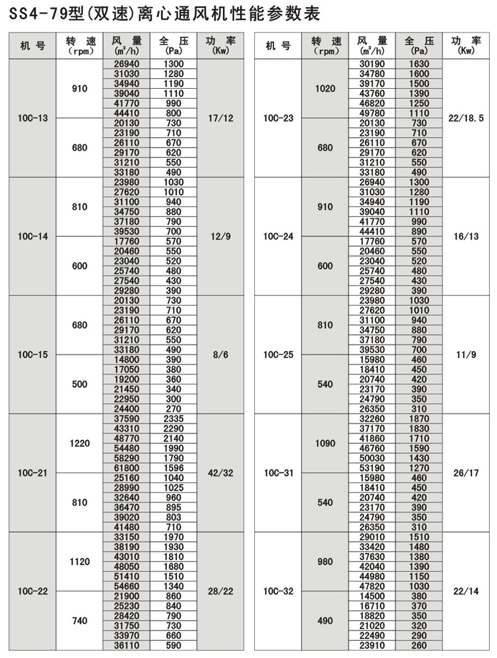 SS4-79系列双速噪声离心式通风机,以4-79型离心式配变极多速三相民步电机构成,使风机在保留原型风机优特点的同时,又具有转速可调,风量及风压可在大范围内变化,结构简单,价格合理的优点,可以一机两用,节省投资和运行费用。